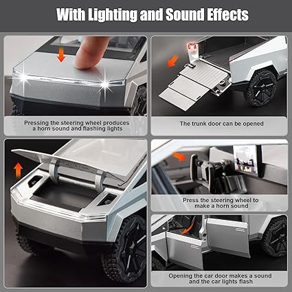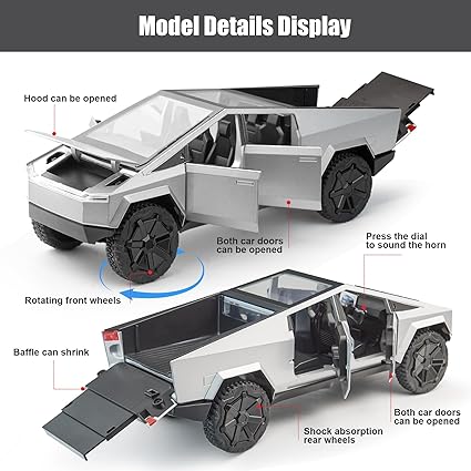 - Scale Model: The cybertruck features high-fidelity details in a 1:24, allowing for realism in its structure, materials, interior, and design. It can be used not only as a toy but also as a model for collection and display